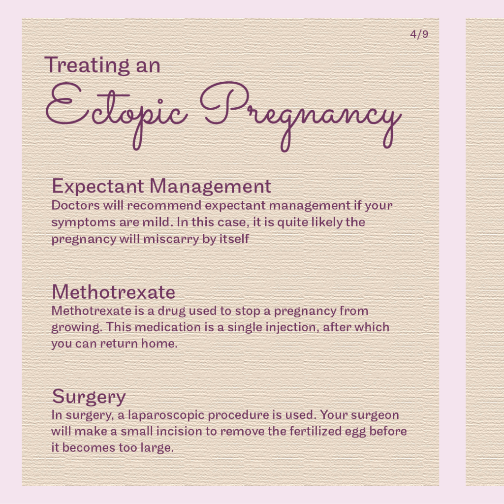 Medical treatments vary depending on when the ectopic pregnancy was detected. Doctors will also take your symptoms into account and discuss treatment options they think best suit your situation (6).