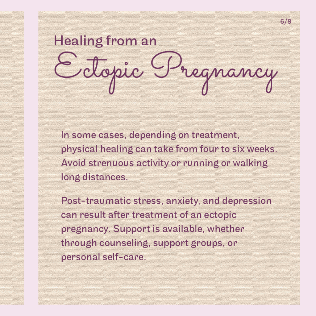 Emotional healing will need to take place as well. Oftentimes, women can experience feelings of grief after an ectopic pregnancy. Post-traumatic stress, anxiety, and depression can result after treatment of an ectopic pregnancy (7). Support is available, whether through counseling, support groups, or personal self-care. The most important thing is to be gentle with yourself. Give yourself time for the recovery you need.