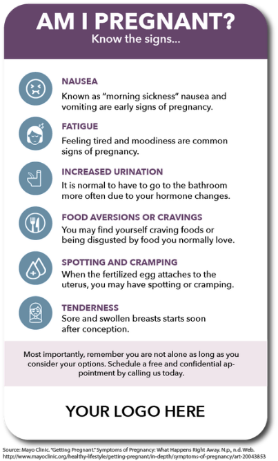 At NAME OF CENTER we have compiled this list of questions to determine whether you may be pregnant. Please contact NAME OF CENTER if you have any other questions or would like to make an appointment for a free and confidential consultation.